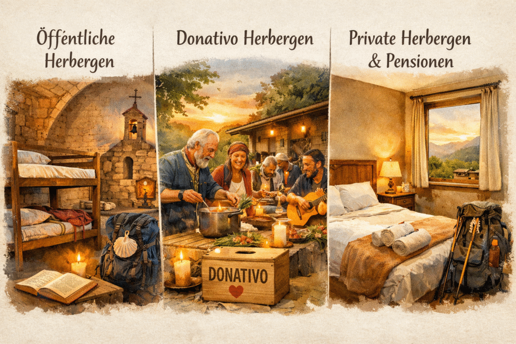 Diese werden meist von Gemeinden oder Kirchen betrieben und sind besonders preiswert. Sie sind einfach, aber sauber – und vermitteln echtes Pilgerfeeling.